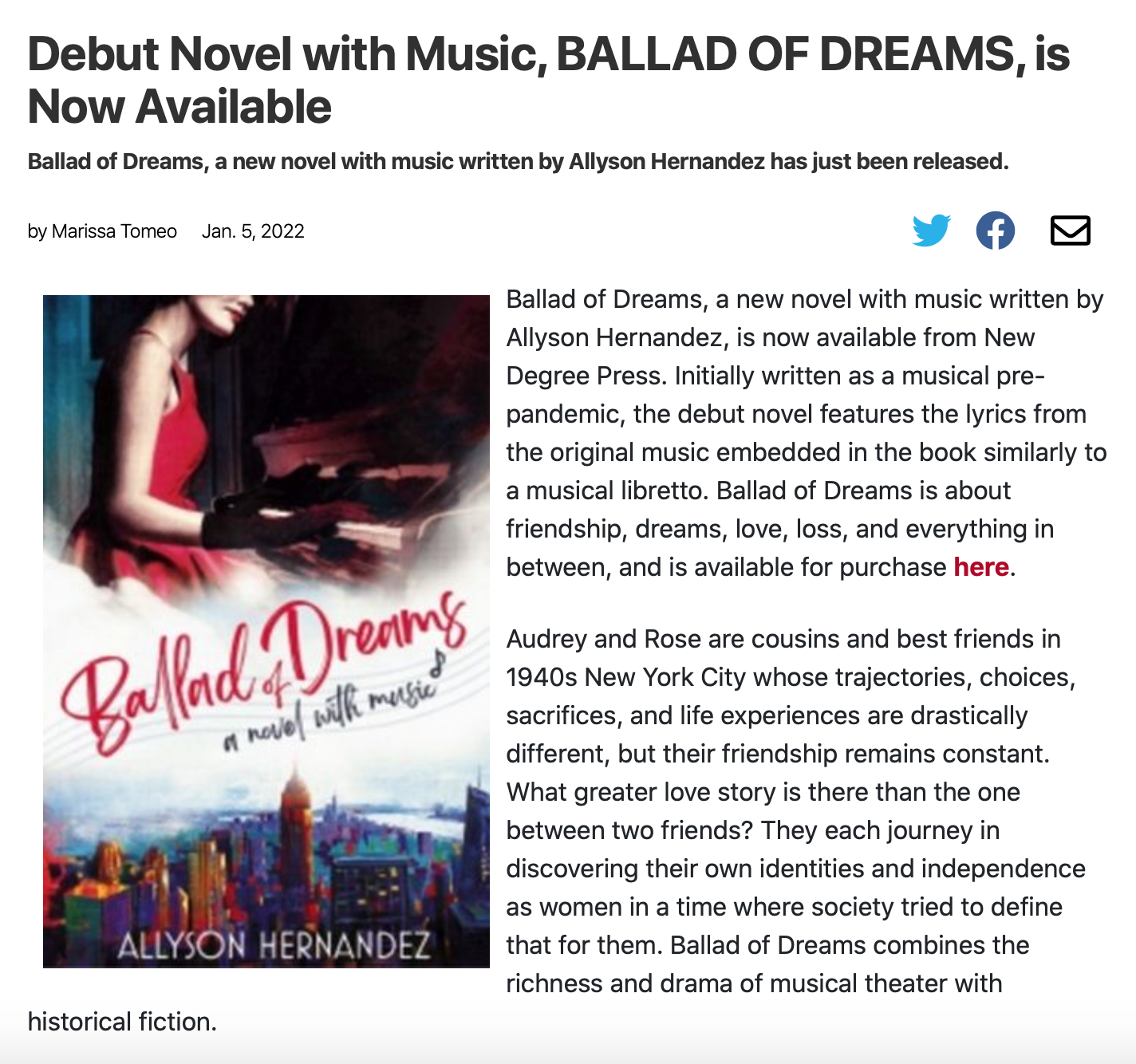 Jennifer Jean Miller, Patch StaffPosted Wed, Jan 5, 2022 at 10:30 pm ETReply“Ballad of Dreams: A Novel with Music,” by Allyson Hernandez of Chatham Township, is celebrating its launch. (Image courtesy of Allyson Hernandez)CHATHAM, NJ — Before COVID, Allyson Hernandez had what she called a "midlife creative crisis," when two days before she turned 40, her grandmother Marie passed away at 96. "Something happens when you turn 40," she wrote in introducing her novel and explained in the video below about "Ballad of Dreams: A Novel with Music," published by New Degree Press.