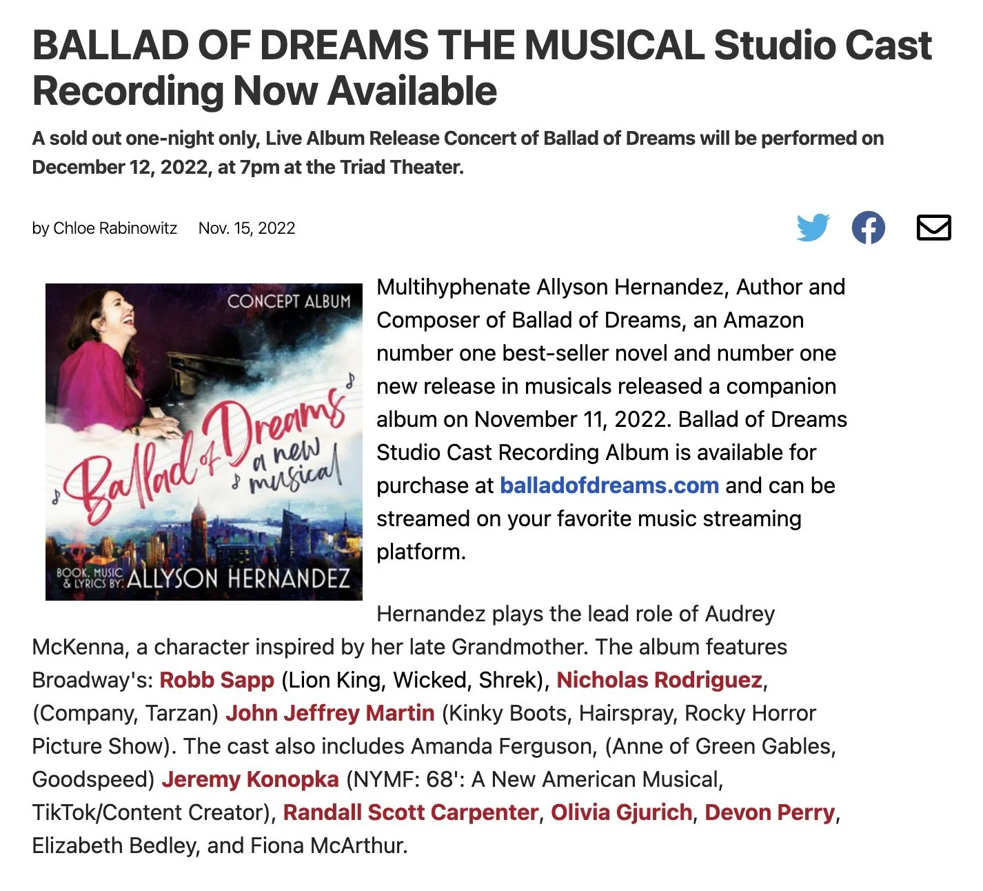 Ballad of Dreams got a mention in the Broadway Briefing, February 11th newsletter!